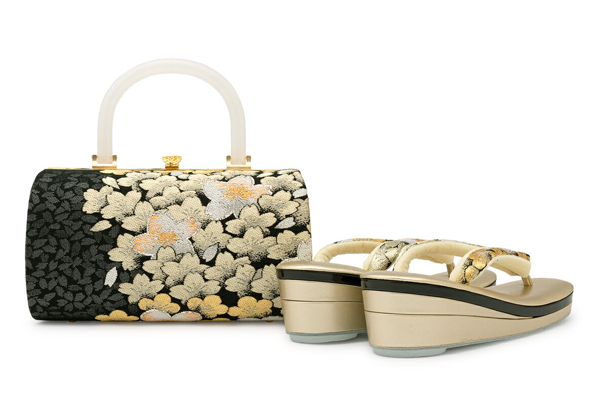 バッグと草履の鼻緒には、輝かしい金色の糸を使った桜の花々が豪華に織り込まれています。
