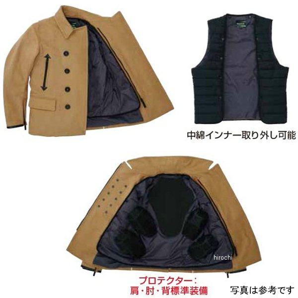 カワサキ純正 秋冬モデル カワサキライディングピーコートサイズ:Sカラー:ベージュ標準装備プロテクター:背、肩、肘取付可能プロテクター:胸【素材】表地:ウール裏地:ナイロン(防寒用/タフタ)部分素材:ポリウレタン(合成皮革)インナー:ナイロンインナー部分:ポリエステルインナー中綿:ポリエステル【仕様説明】大人気のピーコートにライデイングの必須要素となるプロテクターを内蔵し、スタイリッシュなデザインを表現。