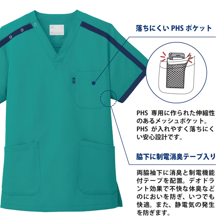 MIZUNO ミズノ - unite ユナイト - スクラブ [男女兼用] 商品の特長 スポーツメーカー「MIZUNO(ミズノ)」と ユニフォームメーカー「CITOSE(チトセ)」が 共同開発した医療用ユニフォーム。
